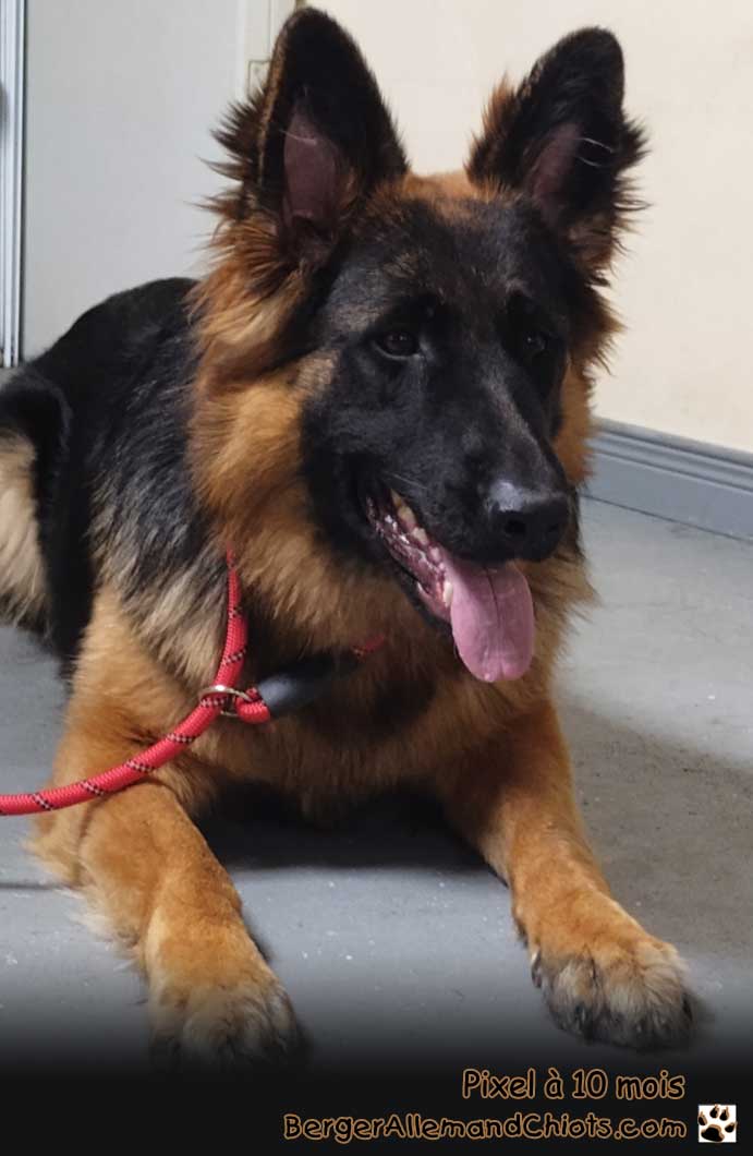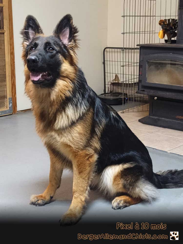 Il est né le 26 octobre 2020, il est beau et remarquablement attachant. Sa fiche santé est excellente, bon chien de famille, exempt de la myélopathie dégénérative avec hanches et coudes en excellence. Tous les tests de santé sont effectués, hanches et coudes parfaits. Aucune copie de la myélopathie dégénérative et il peut saillir toutes nos femelles. 215 tests santé et traits ont été effectués aux E.U par ADN et tous sont revenus clairs. Sa personnalité se démarque par un caractère très sociable avec les humains, les enfants, et les autres animaux. Inné en lui d’être un gardien, fidèle au berger allemand. Nous n’avons que d’éloges à son égard! Nous aimerions bien vous donner un petit trait de caractère désagréable mais je crois que l’humain en possède davantage (rires). Il est très avantageux de donner un bon début de vie à un berger allemand pour obtenir ces résultats. Il faut être en sa présence pour comprendre que c’est un chien qui frôle l’excellence. C’est tests d’ADN pourront être fournis sur demande lors de l’acquisition du chiot. Sa fourrure est noir et feu à poil court.